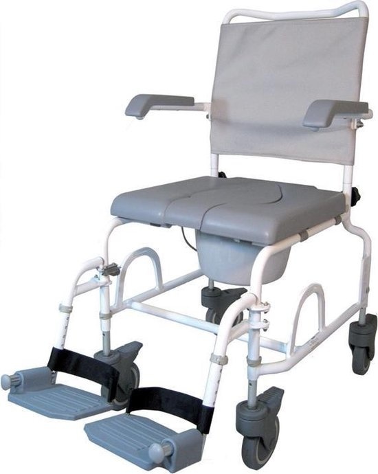 De materialen zijn zeer hoogwaardig kunststof in combinatie met wit gepoedercoat aluminium waardoor de stoel, inclusief de wielen en lagers, volledig water- en schoonmaakmiddelenbestendig. Roestvorming is dus uitgesloten. Deze materialen en de constructie van de stoel zorgen ervoor dat reinigen eenvoudig is. De stoel is voorzien van 4 wielen. De wielen hebben zeer goede remmen (ook in natte ruimtes) en voetensteunen die verstelbaar, wegklapbaar of helemaal weg te nemen zijn. De voetsteunen hebben een enkelband zodat de voeten niet van de voetsteunen afglijden. Een extra steun die ook de nodige extra veiligheid biedt. Dankzij de wegklapbare armleuningen kunt u ook zelf of met hulp een simpele transfer maken.
