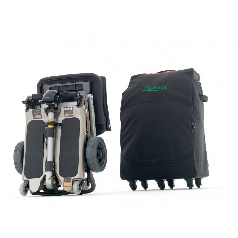 Deze Freerider Luggie Scootmobiel weegt slechts 23 kg. Hij is in drie zeer eenvoudige stappen opvouwbaar tot handige trolly die u zo met u mee rolt. De Freerider Luggie past gemakkelijk in de achterbak van uw auto. Zelfs in de kleinste auto past hij achterin of in de kofferruimte! Hij is ook zeer geschikt voor op een cruiseschip, vliegtuig of trein. De Freerider Luggie Scootmobiel is ook de enige vouwscootmobiel die in een vliegtuig geaccepteerd wordt met 8.5 amp accu. De Freerider Luggie Scootmobiel kan uitgerust worden met een lichtgewicht reistas en een extern laadstation.