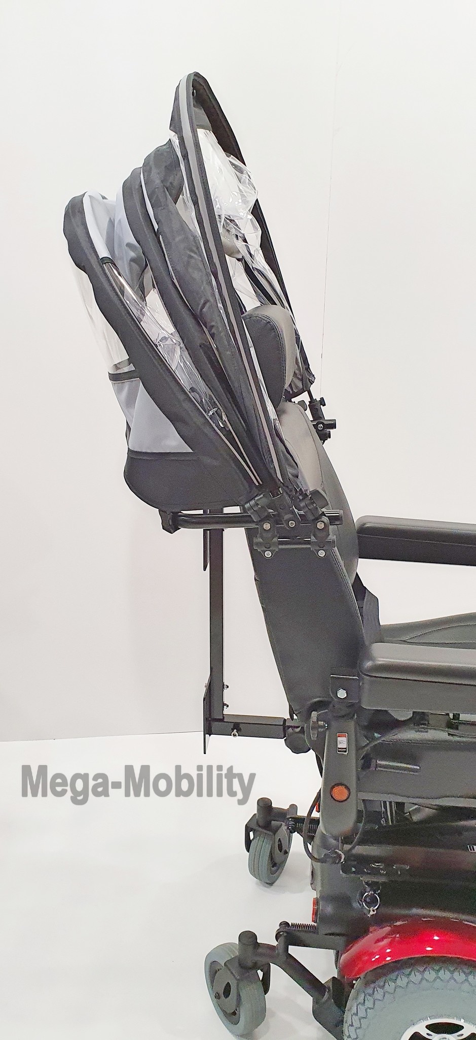 Hij kan worden geïnstalleerd op bijna elke elektrische rolstoel die is uitgerust met een horizontale of 2 verticale buizen achter de zitting of met een hoofdsteun die wordt vastgehouden door 2 verticale glijbuizen.